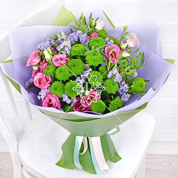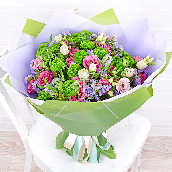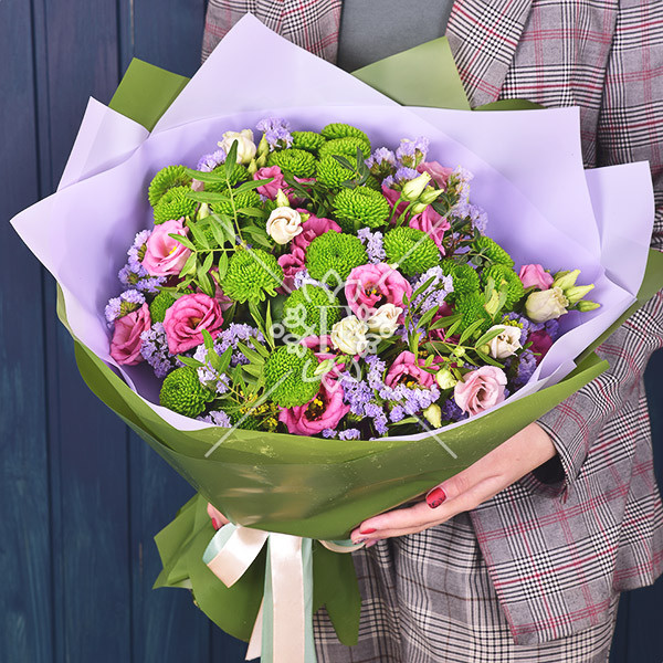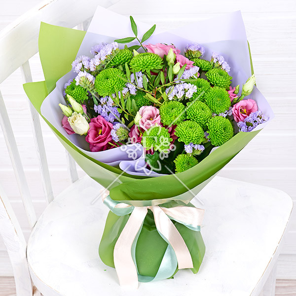 хризантема зеленая кустовая – 2 шт., эустома розовая – 3 шт., статица светло-фиолетовая (фиолетовая) – 1  шт., зелень декоративная (фисташка), упаковка, лента.