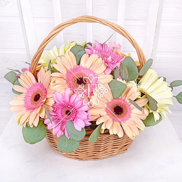 Невероятные герберы  розового, кремового и персикового оттенка в сочетании с зеленью эвкалипта выглядят совершенно. От композиции в цветочной корзинке невозможно отвести восторженный взгляд!