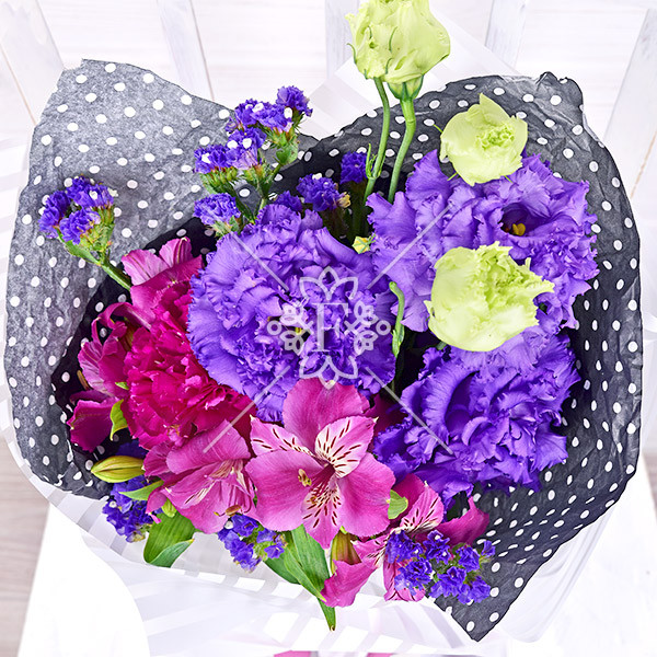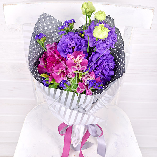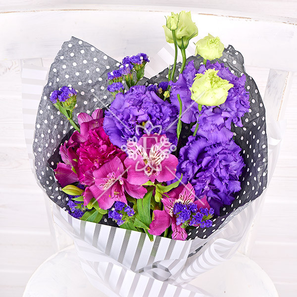 Эустома фиолетовая – 1 шт., альстромерия фиолетовая – 1 шт., гвоздика темно-сиреневая- 1 шт., статица фиолетовая – 1 шт., упаковка, лента.