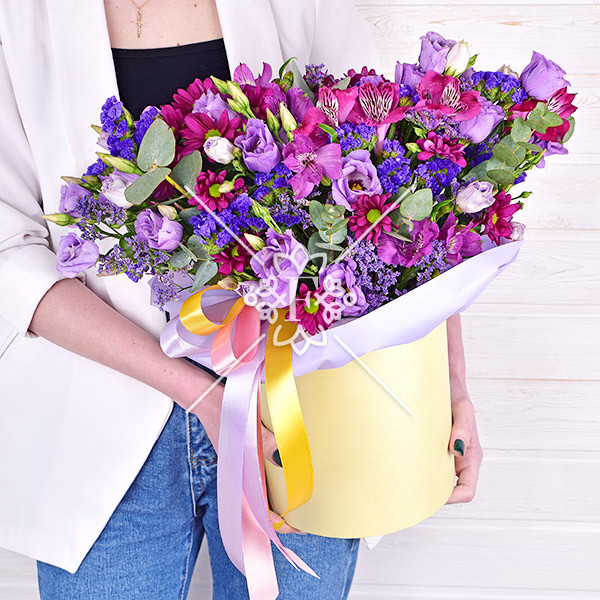 В состав этой удивительно-прекрасной флористической легенды вошли фиолетовая эустома и альстромерия, статица цвета индиго, малиново-фиалковая кустовая хризантема, лавандового оттенка лимониум и нежно зеленый эвкалипт.